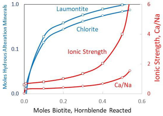 which produces a residual Ca–Na–Cl brine with a pH ~6.7. Minor amounts (<0.02 moles) of epidote, calcite, and gypsum form as well. Calculations indicate that the albite and K-feldspar masses increase substantially. Almost all of the original quartz is dissolved. There is a net loss of 4.9 moles of liquid H2O that causes the ionic strength of the solution to increase from an initial starting ionic strength of 0.5 M to >6 M (Figure 1). Typically, PHREEQC runs stopped or crashed at high ionic strengths. Stoichiometrically, there is an addition of 0.54 moles of H2O from hornblende dissolution, 0.54 moles from biotite dissolution, and 1.29 moles from muscovite dissolution, followed by a free water loss of 7.23 moles by incorporating H2O into laumontite and chlorite, hence a net loss of 4.86 moles of free water from granite hydrolysis. This means that the initial 0.1 L of water (5.55 mol) is reduced to 0.012 L, which results in a much higher level of salinity. Note that the higher ionic strength absolute values are uncertain due to the simplified activity coefficient model used here.