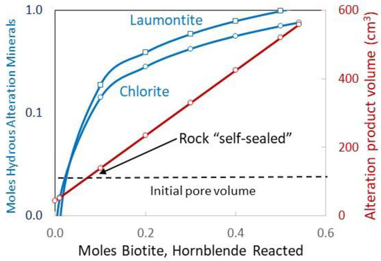Figure 2 suggests that altering the product accumulation will ultimately limit granite hydrolysis. Recall that the calculation begins with 100 ml of seawater. The change in net rock volume, which is the volume of minerals grown minus the volume of minerals dissolved, exceeds the starting water volume before the 0.1 moles of biotite + hornblende reaction has occurred. Because of this self-sealing characteristic, the fluid–rock reaction is expected to be locally distributed. In flowing wide aperture fractures, where fluids have continual access to granite surfaces, hydrolysis proceeds to the high salinity end-member fluids. Dead-end fractures see less reaction before sealing.