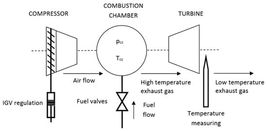 The GT system can be conceptually split into three main macrocomponents: compressor, combustion chamber (CC), and turbine. A symbolic scheme is shown in Figure 1.
