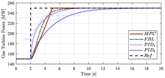 As far as PID controllers are concerned, two different sets of parameters have been defined in Table 3, since heavy-duty GT operation is usually a trade-off between the time response of the power channel and the preservation of the machine lifetime by avoiding CCT spikes. Thus, the first set of PID parameters were proposed in order to achieve a quick power response leading to dangerous CCT dynamics (hereinafter referred to as ), while the second set of parameters were defined in order to preserve the CCT dynamics and thus provide a slower power response (hereinafter referred to as PID2).