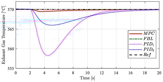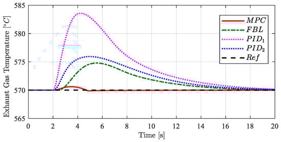 As one can observe from Figure 4, the MPC controller action provided the fastest power response (continuous red line) with respect to the FBL controller (dash dot green line), which provided a slightly lower performance, and both the PID controllers (dotted blue and magenta lines). Also, the EGT behavior was preferable in the MPC case, as shown in Figure 5, since it was the one characterized by the lower variation (less than 1 °C).