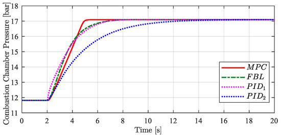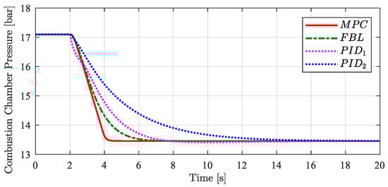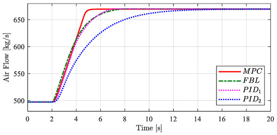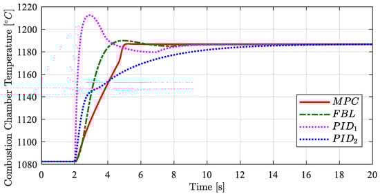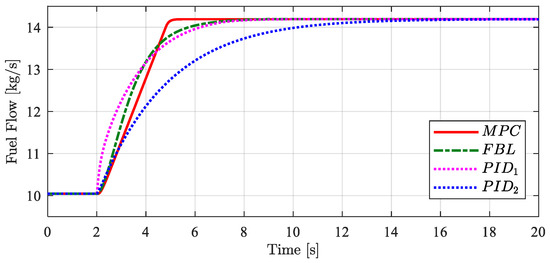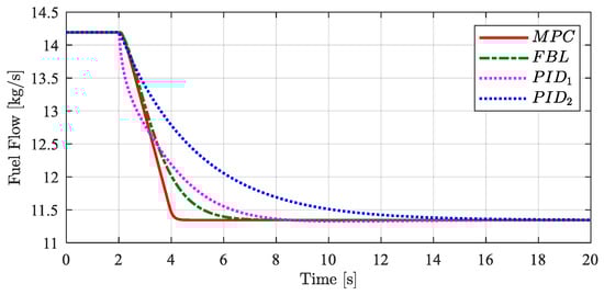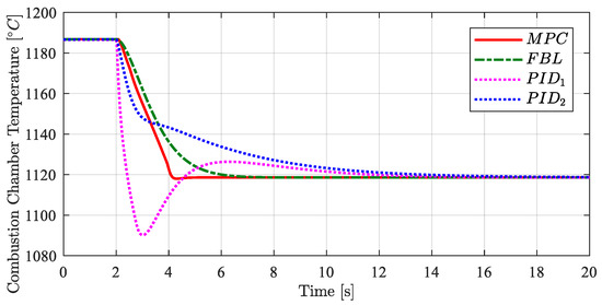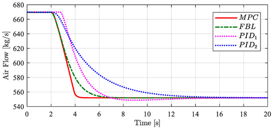 As one can see from Figure 10, the MPC controller provided the quickest power response, reaching the final reference value in almost 2 s. The EGT time profile again slightly changed, providing a good time response, as one can see from Figure 11.