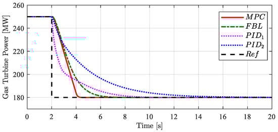 The aim of this section is to evaluate the performance of the proposed MPC controller under realistic operational transients. As already pointed out in Section 2.2, the proposed controller was tested using as a testbed the accurate GT model defined in Section 2.1. This allowed determining the robustness of the proposed MPC controller in the presence of modeling uncertainties and against the assumption made for the controller design. In order to exhaustively assess the proposed MPC controller, its performances were evaluated in comparison with a traditional PID-based controller and an alternative model-based control technique, namely, the FBL technique, which has already been applied to control heavy-duty GTs [6]. As a matter of fact, the FBL procedure leads to an equivalent linear relationship between the controlled outputs and the fictitious inputs, as shown in Figure 3 [5].