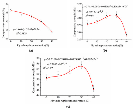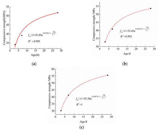 (a) Compressive strength fitting equation of 3d; (b) Compressive strength fitting equation of 7d; and (c) Compressive strength fitting equation of 28d.