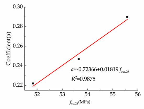 From the regression curve in Figure 6, the regression coefficient a in the SCC with a low content of fly ash and silica fume has a certain relationship with its compressive strength. Figure 7 shows the regression analysis carried out by using the data in Table 9.
