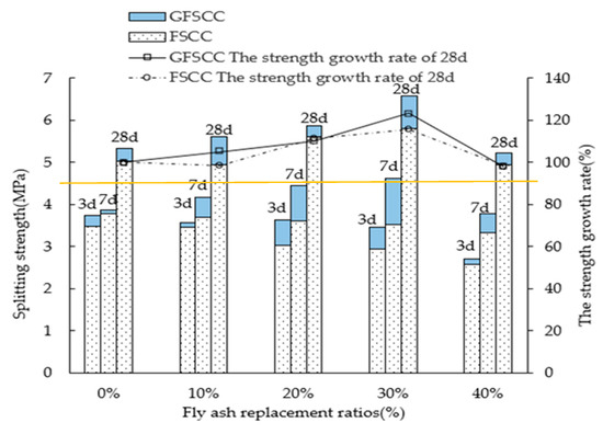 The test was completed on a 1000 kN Microcomputer controlled electro-hydraulic servo universal testing machine (SHT4106, Jinan, China). As shown in Figure 8, the splitting tensile strength, growth rate, and the changing trend of the splitting tensile strength are similar to its compressive strength property, as discussed above.