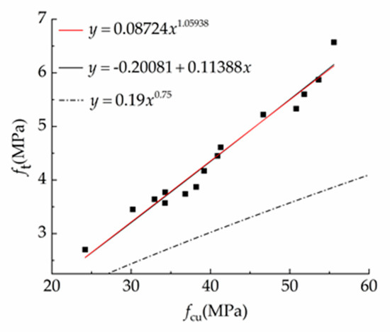 The relationship between the splitting tensile strength and compressive strength of SCC is shown in Figure 9.