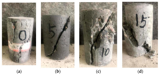 The test shows that the failure mode of the specimen is related to the confining pressure value. As shown in Figure 12, under uniaxial compression (σ2 = σ3 = 0), a vertical crack parallel to the loading direction appears in the middle of the specimen. With the increasing of the loading, one or several main cracks penetrated and destroyed the specimen. When the confining pressure values are changed to σ2 = σ3 = 5 MPa and σ2 = σ3 = 10 MPa, the initial crack is no longer a vertical crack but an inclined one at 25 degrees to the vertical loading direction, and the failure surface is mainly the shear failure of the cement mortar. When the confining pressure value is σ2 = σ3 = 15 MPa, the middle part of the specimen slightly bulged, and the oblique cracks penetrated through the whole specimen with an oblique crack angle of about 45 degrees. The coarse aggregate on the shear flour was sheared, and the crushed cement mortar powder was found on the failure surface.