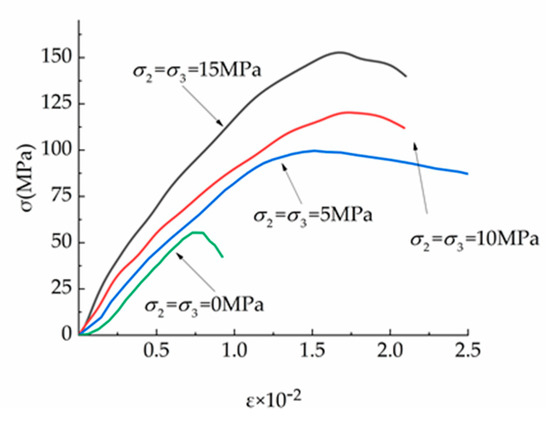 (a) σ2 = σ3 = 0 MPa; (b) σ2 = σ3 = 5 MPa; (c) σ2 = σ3 = 10 MPa; and (d) σ2 = σ3 = 15 MPa.