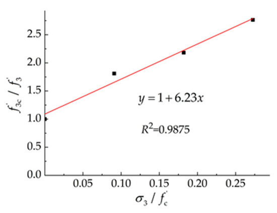 In this formula, represents the uniaxial compressive strength; represents the triaxial compressive strength, and the K value of ordinary concrete with different strengths is obtained through previous research [32]; it ranges from 2.6 to 5.3. The K value of SCC is 6.23, which is different from that of ordinary concrete, and the revised Mohr-Coulomb criterion is shown in Figure 14.