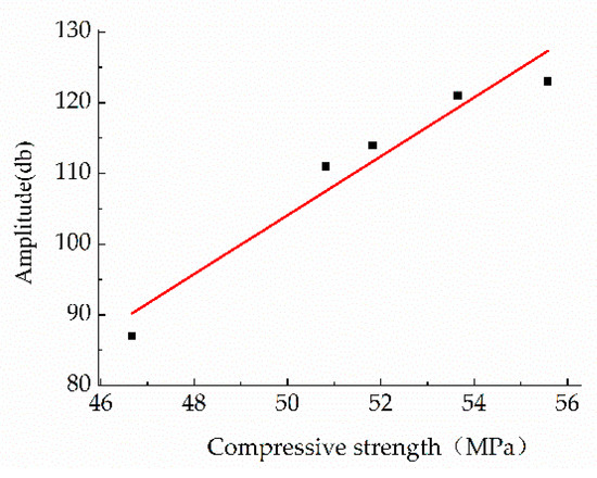 The ultrasonic test of concrete was carried out on a NM-4A nonmetallic ultrasonic testing analyzer that was manufactured by a Concrete Company in Beijing. Five measuring points are arranged on each side during the ultrasonic test, as shown in Figure 15. During the detection, the coupling agent should be evenly coated on the probe, and the probe should be centered on the measuring point. In addition, the transmitting and receiving transducers need to be kept on the same line, and the measuring points of the test block should take the average value of 10 groups. The spectrum-amplitude diagram obtained by performing a Fast Fourier Transform is based on the measured sound wave which is shown in Figure 16. It can be seen from the spectrogram that, as the SCC intensity increases, the obtained amplitude conversion is higher. As a result, the relationship between the intensity and amplitude was obtained, providing reliable guidance for engineering applications. The fitting curve is shown in Figure 17.