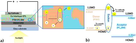 In the conventional configuration of a bulk heterojunction organic solar cell (Figure 1a) [,,,], a transparent substrate; which can be made of glass and rigid or made of polyethylene terephthalate (PET) and flexible, is coated with a transparent conductor that serves as the anode. The transparent substrate and anode allow light to pass through so that it may be exploited by the photoactive layer. Indium-tin oxide (ITO, In2O3:Sn), a transparent conductive oxide, is one of the most popular employed anode materials due to its transparency and low sheet resistance []. In between the anode and the absorbing photo-active layer a hole transport layer (HTL) is placed. This transporting layer operates as an electron blocking layer and at the same time serves as a hole conductor. This dual function lowers a lot the recombination rates and thus enhances the performance of the photovoltaic device [,]. Poly(3,4-ethylenedioxythiophene)-poly(styrenesulfonate) (PEDOT:PSS) is one of the most widely used HTL in organic solar cells []. In BHJ organic solar cells, the active layer typically consists of a blend of an electron donor and electron acceptor materials []. The active layer consists of a mixture of a fullerene derivative e.g., ([6,6]-PhenylC71butyric acid methyl ester, named PC71BM (the electron acceptor) and a conjugated polymer e.g., (Poly[[4,8-bis[(2-ethylhexyl)oxy]benzo[1,2-b: 4,5-b′]dithiophene-2,6-diyl][3-fluoro-2-[(2-ethylhexyl)carbonyl]thieno[3,4-b]thiophenediyl]], named PTB7 (the electron donor).
