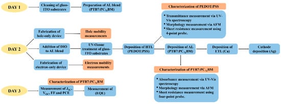 The flow chart of the three days experiment step-by-step. ITO: indium-tin oxide; AL: active layer; ETL: electron transport layer; HTL: hole transport layer; EQE: external quantum efficiency; JSC: short circuit current density; VOC: open circuit voltage; FF: fill factor; PCE: power conversion efficiency; DIO: 1,8-Diiodooctane; AFM: atomic force microscopy.
