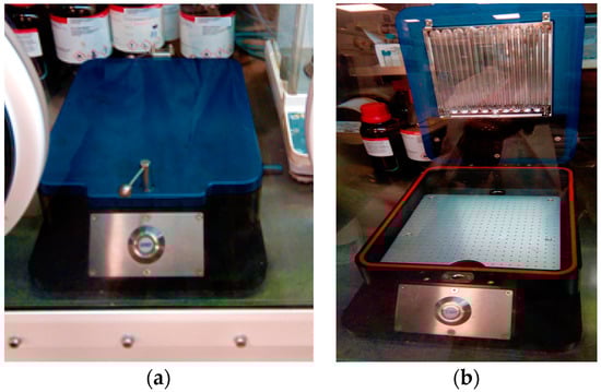 UV-O3 cleaner used in the final step of the cleaning process of ITO-glass substrates shown both in the closed (a) and open position (b) and located inside the glove box.