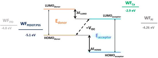 The open circuit voltage (VOC) is the maximum voltage provided by the solar cell and occurs under open circuit mode. The VOC should be representative of the difference between the work function (WF) values of the electrodes. A device with an ITO anode (WFITO = 4.7–4.9 eV) and an Ag cathode (WFAg = 4.2 eV) should yield, in theory, a VOC of 0.5–0.7 eV. However, VOC values are analogous in practice with a typical value linearly dependent on the energy difference between the EHOMO of the donor material and the ELUMO of the acceptor material (Figure 5).