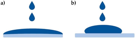 The PEDOT:PSS was purchased as a pre-mixed aqueous dispersion with a concentration of 1.3 to 1.7 wt.%. It was stored in a refrigerator for preservation. Before it can be used, it was allowed to reach room temperature in order for its viscosity to be recovered (10–30 cP at 20 °C). The PEDOT:PSS dispersion was deposited via static spin coating. The equipment used can be seen in Figure 6a,b. When it had reached room temperature and was ready to be used, PEDOT:PSS was taken from the vial using a syringe. A 0.45 μm Polyvinylidene Fluoride (PVDF) filter was fixed onto the syringe to remove any impurities or aggregated particles as the PEDOT:PSS was applied. The PEDOT:PSS was applied to the glass-ITO substrate using this syringe-filter set up. Using the settings screen, the spin-coater was set to spin the substrate at 6000 rpm for 60 s []. The substrate was then positioned ITO-side up in the center of the rotator. The substrate was held in place via vacuum suction. The PEDOT:PSS was then spread on the substrate with the syringe-filter set up, the lid of the spin coater was closed, and the spin coater was activated. This procedure can be seen performed on a glass-ITO substrate that has undergone UV-O3 treatment and on one that has not in Videos S1 and S2 respectively (provided as supporting material). Students should note that the PEDOT:PSS exhibits better adhesion to the UV-O3 treated substrate, compared to the untreated one, as depicted in Figure 7. This is due to the increase in hydrophilicity of the surface. It is advised that students repeat this process in order to see firsthand the impact of UV-O3 treatment on the quality of the PEDOT:PSS film. When the spin coating procedure was completed, the wiping process was carried out in which a strip of PEDOT:PSS from the top and bottom section of the substrate was wiped away with a cotton swab soaked in deionized water (Video S3). This strip was removed to ensure that the cathode came into contact with the anode (ITO layer) without the HTL blocking it. After this wiping process, the substrates were placed in an oven at 120 °C for 15 min in order to remove the humidity and aid the crystallization of PEDOT:PSS thus forming the HTL film.