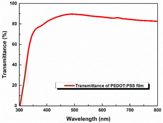 Transmittance spectrum for PEDOT:PSS film with a thickness of 25 nm deposited on ITO anode.