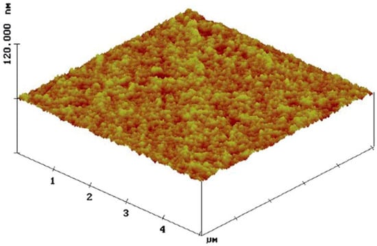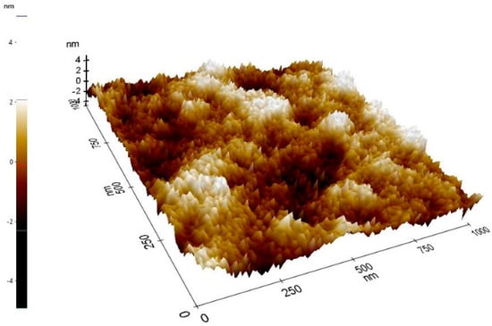 The PEDOT:PSS film that had now been spin coated on the UV-O3 treated glass-ITO substrate and thermally annealed underwent an AFM measurement which gave us information of the film’s morphology, as well as of its roughness. AFM 3D images for PEDOT:PSS films had revealed areas of smaller and larger heights which are represented in the image by light and dark areas respectively. These bright and dark areas are commonly associated with PEDOT and PSS rich regions [,]. The low RMS value for the pristine PEDOT:PSS film of 1.124 nm implied its smooth surface (Figure 9).