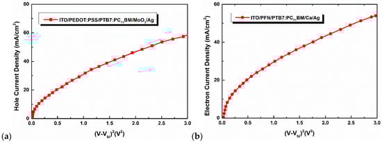 (a) Hole current density-(V-Vbi)2 graph obtained for a bulk heterojunction organic solar cell based on PTB7:PC71BM. (b) Electron current density-(V-Vbi)2 graph obtained for a bulk heterojunction organic solar cell based on PTB7:PC71BM. The hole mobility and electron mobility values are calculated by adding the respective JSC values to the Mott–Gurney equation (Equation (3)) and solving for μ.