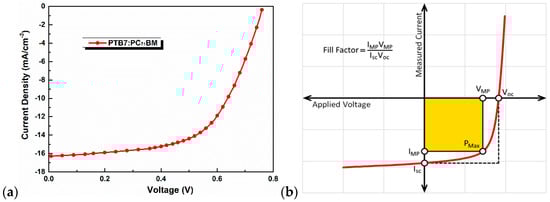 (a) J–V curve for organic photovoltaic device based on PTB7-PC71BM. (b) The fill factor demonstrated graphically on the J–V curve. Image remains the copyright of Ossila Ltd. Taken with permission from Ossila Ltd. [].