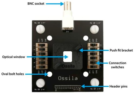 The test board used for making electrical connections to the photovoltaic devices. The substrate is placed in the center of the board and the cell which is to be characterized is selected using the respective switches. Image remains the copyright of Ossila Ltd. Taken with permission from Ossila Ltd. [].