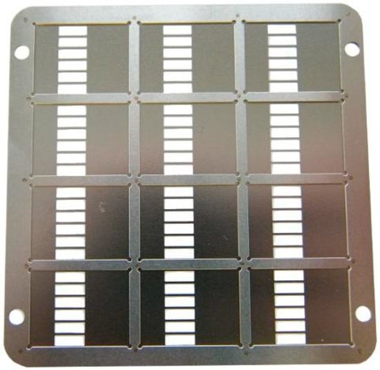 Mask purchased from Ossila used to create the cathode pattern during the deposition of Ag via vacuum thermal evaporation (VTE). Image remains the copyright of Ossila Ltd. Taken with permission from Ossila Ltd. [].