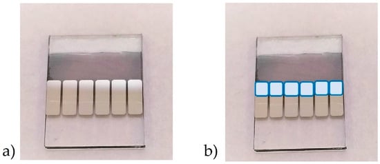 The shadow mask used for the device patterning during Ag deposition via vacuum thermal evaporation (VTE) is shown in Figure 15. The complete fabricated BHJ OSC device is shown in Figure 16a, where Ag was used as the cathode (silver area). The blue squares superimposed onto the photograph indicate the active area of the device (Figure 16b). The active area is that in which all layers of the OSC are present, starting from the ITO anode and ending at the Ag cathode. This is the area in which photocurrent is generated.