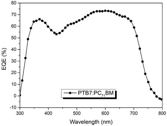 Also observed in the EQE curve is the contribution of PC71BM to the generated photocurrent. This is evident from the peak observed between 360 nm and 380 nm. This shows that light absorption and charge generation i.e., exciton formation does not take place only in the electron donor polymer, but also in the fullerene-based electron acceptor [,].