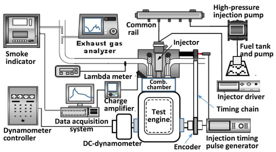 The engine experiment was conducted at an engine speed of 1200 rpm and an injection pressure of 160 MPa. In addition, the fuel injection system consisted of a solenoid type injector with an eight-hole nozzle controlled by an injector driver (TEMS, TDA-3300H, Korea). The ambient pressures and injection quantity were 0.1 MPa and 10 mg/stroke, respectively. An injector driver synchronized with a crank angle sensor was used to control the fuel injection quantity and injection timing.