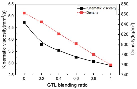 The kinematic viscosity and density of the GTL-biodiesel fuel due to the GTL fraction.
