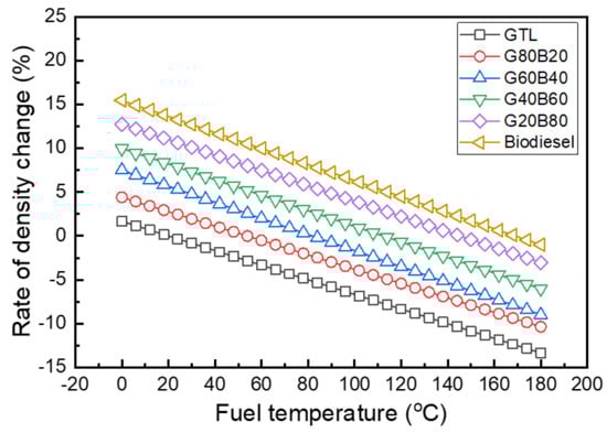 As illustrated in Table 3, the density of the GTL fuel is lower than the densities of the diesel and biodiesel fuel, and the viscosity is lower than that of the biodiesel fuel. In this work, the rate of the density changes of the GTL-biodiesel blends at various fuel temperatures are calculated using the empirical formula investigated by Park et al. []. The empirical formula of the fuel density according to the temperature change can be determined using the following equation []: