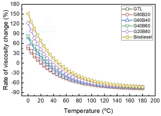 In this equation, νblend is the blend viscosity, and α′, β′ and δ′ are the constants determined by Park et al. []. Figure 4 shows the rate of the kinematic viscosity change (rviscosity) of the biodiesel blended GTL fuels at various temperature conditions. In this figure, the rate of the viscosity change is calculated by using the same type of Equation (2) as that used for the GTL-biodiesel viscosity. The rate of the viscosity change showed a decreasing trend with increasing GTL blending ratios. In general, the kinematic viscosity of the neat biodiesel is higher than that of the GTL fuel because of the higher density and increased molecules per unit volume compared to the GTL fuel. As presented in Table 3, comparing the fuel viscosities of the three fuels yields that the viscosity of the biodiesel is the highest among the test fuels. With an increase in the test fuel temperature, the rate of the viscosity changes gradually decreased in accordance with the increase in the biodiesel volume fraction.
