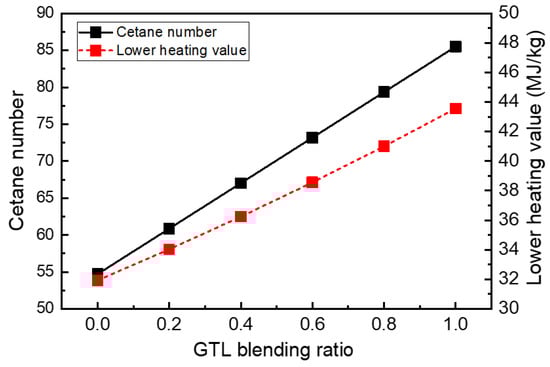 The cetane number (CN) and lower heating value (LHV) of the GTL-biodiesel blends according to the GTL blending ratio are shown in Figure 5. As shown in this figure, as the GTL fraction increased, the CN at the blending ratio 0 was 54.5, and the CN was 85.5 at the GTL blending ratio 1.0, while the LHV of the blends were 31.926 MJ/kg and 43.561 MJ/kg at the GTL blending ratios 0 and 1.0, respectively. The LHV of the GTL-biodiesel blends were increased as the GTL content was added. The increase in GTL with a relatively higher LHV in the blend resulted in an increased total heating value. As shown in the increasing trend of the CN, the increase in the GTL fraction led to an increase in the CN of the GTL-biodiesel blend because the GTL fuel has a higher CN than the biodiesel fuel.