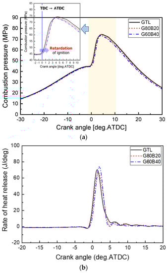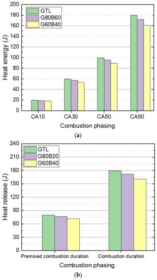 A comparison of the heat releases of the test fuels at various combustion phases is shown in Figure 8. As can be seen in the combustion energy distribution, the GTL fuel has the highest heat release, and the GTL-biodiesel blend shows a decreasing trend according to an increase in the biodiesel fuel. The amount of heat release for the G60B40 fuel indicated the lowest value, while the GTL fuel showed the highest value, because the heating value of the GTL is higher than that of the other fuels. In addition, the heat release of the premixed combustion duration for the GTL fuel is also the highest among the test fuels, and that of G60B40 is the lowest, as shown in Figure 8b.