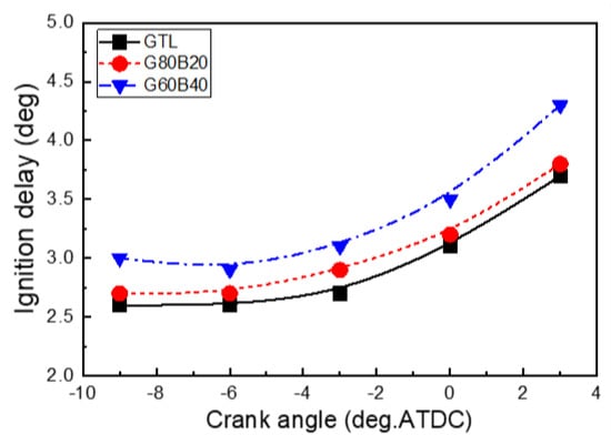 Figure 6 shows the combustion pressure and rate of heat release (ROHR) characteristics of the GTL-biodiesel blended fuels at an injection pressure of 160 MPa and injection timing of 3° BTDC. The combustion pressure histories of the GTL fuel were shown to be higher than those of the biodiesel blended GTL fuels. As indicated in the pressure-crank angles curve (Figure 6a), the combustion pressures in the cylinder were increased with the increasing GTL volumetric fraction because the lower distillation characteristics of GTL improve the spray characteristics and atomization performance. Comparing the distillation properties of the GTL and diesel fuel yields that the 90% distillation point (T90) is about 6.3% lower that of the diesel fuel []. Therefore, the lower T90 assists the evaporation and combustion characteristics of the GTL fuel. Regarding the fuel properties, the higher CN and low T90 play an important role in the heat generation and rate of heat release, as shown in the figure. In addition, Figure 6 shows the earlier ignition in the GTL. This can be attributed to the higher CN of the GTL (the blending of the biodiesel leads to a decreased CN in the blended fuels). A detailed discussion of the ignition delays is presented in Figure 7.