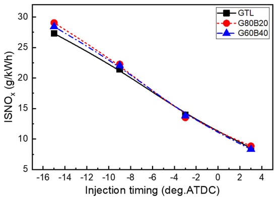 The exhaust emission characteristics of the GTL-biodiesel blended fuels is shown in Figure 9, Figure 10 and Figure 11. The emissions are expressed in IS unit, which means that they are indicated specifically with the unit of g/kWh. The NOx emissions for the test fuels are presented as a function of the injection timing in Figure 9. In the figure, the GTL fuel exhibits lower NOx emissions than the biodiesel blended GTL fuel across all of the injection timings. The results of several studies on the effects of the GTL fuel on diesel engines showed lower NOx concentrations [,,]. The formation of NOx emissions is affected by various factors under different operating conditions, not one exact reason. Regarding the GTL fuel, the higher CN led to a shorter ignition delay, as shown in Figure 7. In terms of the fuel properties on the NOx formation, the significantly lower aromatic hydrocarbon content in the fuel reduces the adiabatic flame temperature, which enhances the reduction of the NOx formation. On the other hand, the effect of the test fuels on the NOx emissions is smaller than that of the injection timings. As plotted in the NOx emissions, the advanced injection timing resulted in significantly increased NOx emissions because of the increasing amount of accumulated injections due to the advanced fuel injection.