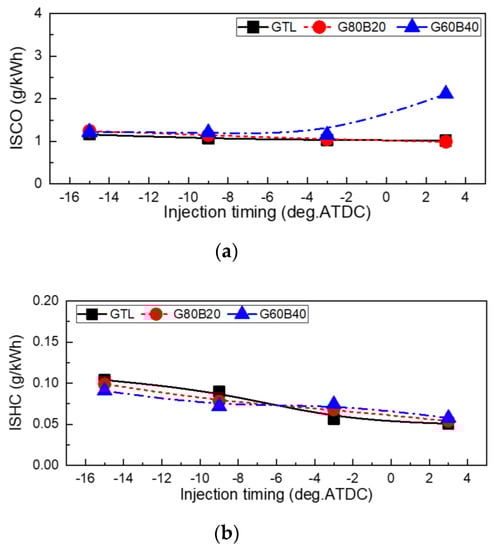 Figure 10 shows the effects of the GTL-biodiesel blends on the CO and HC emissions at an injection pressure of 160 MPa. In the range of the injection timing over 9° BTDC, the CO emissions of the GTL fuel were almost similar to those for the GTL-biodiesel blends, while the higher blend of biodiesel showed more of an increasing trend than the lower blended fuels did (GTL and G80B20) at the retarded range. In the retarded injection timing, the higher blending ratio of the biodiesel is influenced by the late evaporation of the G60B40 fuel because of the poor evaporation and short mixing duration resulting from the reduction of the premixed combustion in the combustion chamber. The HC emissions showed a slight increase at the range of the advanced injection timings. Regarding the HC emission, the GTL and GTL-biodiesel blends showed lower HC emissions. As was the case with the CO emission, the reduction of the HC emissions can be attributed to the fuel properties and higher CN. In particular, the higher CN of the GTL and GTL blends shortens the ignition delay, and the low distillation temperature enhances the fuel evaporation characteristics and the mixing with the air and fuel particles to improve the effective combustible charge in the engine. As mentioned above, the lower LHV and higher viscosity of the biodiesel brings about the deterioration of the GTL blend reaction and specific power performance due to an incomplete combustion. Therefore, the GTL fuel results in lower unburn hydrocarbon emissions in the exhaust emissions [,].
