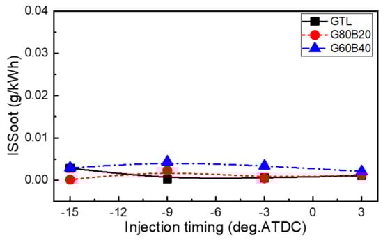 Figure 11 shows the soot emission distribution of the test fuels according to the injection timing. As illustrated in this figure, the effect of the GTL-biodiesel blends on the soot emissions are not significant. However, the GTL fuel showed a lower value than the other fuels. The GTL fuel properties, such as zero sulfur and the low aromatic content associated with a higher hydrogen-carbon ratio, may suppress the formation of particulate precursors []. In particular, the measured ISSoot emission indicated lower values compared to other emissions, and the formation of soot influenced by the excellent CN of the GTL fuel and the kinematic viscosity of the biodiesel in the GTL-biodiesel blends. Therefore, the higher fraction of the biodiesel fuel resulted in a slightly higher emission than that of the lower blending ratio of the biodiesel in GTL blends. The GTL fuel has a higher CN than the biodiesel fuel; therefore, the combustion improvement of the GTL may also favor a decreased smoke emission.