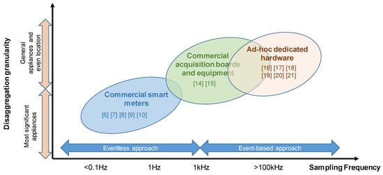 Although some smart meters are capable of acquiring signals in the range of kHz [13], their deployment is not actually so extended among electrical companies, likely due to their higher cost. This is the reason why those efforts focused on high sampling rates have been particularized in the design and development of ad-hoc acquisition systems, most of them based on a current clamp and a voltage sensor, together with fast enough analogue‒digital converter. This trend is followed in [14,15], where an oscilloscope or a power analyser was used as the acquisition module. Furthermore, in order to employ less expensive and more specific and portable hardware, commercial or ad hoc dedicated data acquisition modules have been applied to measure voltages and currents [16,17,18,19,20]. A direct example of this approach is the BLUED database, acquired by a specific hardware design based on a commercial NI 16-bits acquisition board, which samples current and voltage [21]. Figure 1 gathers the different aforementioned alternatives for data collection in NILM applications, according to the sampling rate.