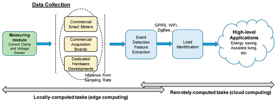 Figure 2 summarizes the above-stated aspects concerning data collection in systems oriented to NILM applications. It is also used to introduce the concept of locally and remotely computed tasks in the context of data collection for NILM applications.