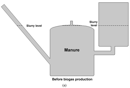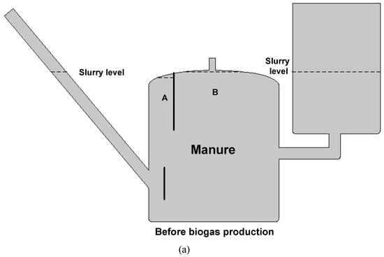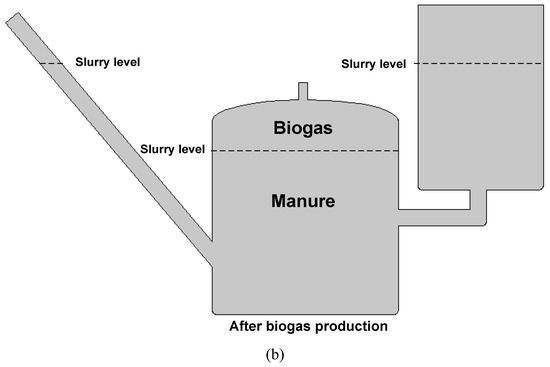 In CDDs, gas pressure is created at the top of the reactor as a result of the biogas produced. The stored biogas pushes part of the slurry into an extension chamber, since the chamber is usually opened. During gas use, pressure is released, and the slurry flows back into the main reactor, creating a mixing regime or cycle (Figure 1a,b). Therefore, CDD depends on the hydraulic variation, i.e., the change of slurry level in the digester and extension chamber during gas use and could be regarded as intermittent natural mixing [6]. Mixing is an important process in anaerobic digestion for establishing contact between micro-organisms and feed for homogenisation of temperature throughout the digester and prevention of settling and floating layers [11].