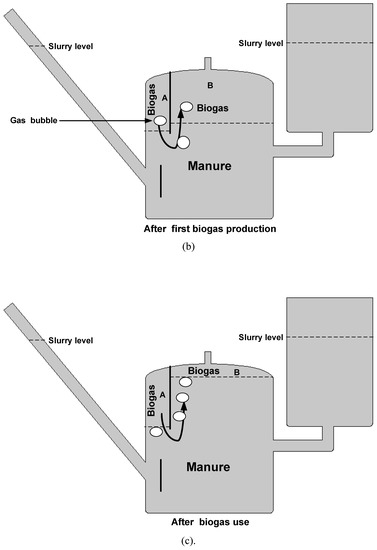 Scheme of the biogas production in the optimised digester (a) before biogas production. (b) Biogas production and flow of gas into compartment B. (c) Biogas production continues, gas flows to compartment B after gas is used.
