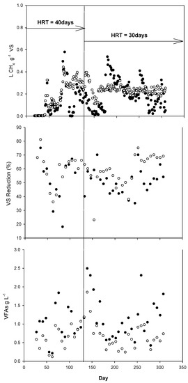 Similarly, a rapid decrease in methane production from 0.35 to 0.10 L CH4/g VS and increase in VFA concentration from 0.7 to approx. 2 g/L was noticed in the optimised reactor when decreasing the HRT to 30 days (days 138–158). Afterwards, the reactor recovered and remained stable until the end of the study (day 309).