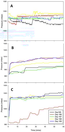 Pressure reading on different days, black—day 165, red—day 166, green—day 167, yellow—day 168, blue—day 169. (a) Measurements taken at the top of baffled side—compartment A of the optimised digester; (b) measurement taken at the top of the unbaffled side—compartment B of the optimised digester; (c) measurement taken at the top of the blank digester. The blank digester has only one compartment.