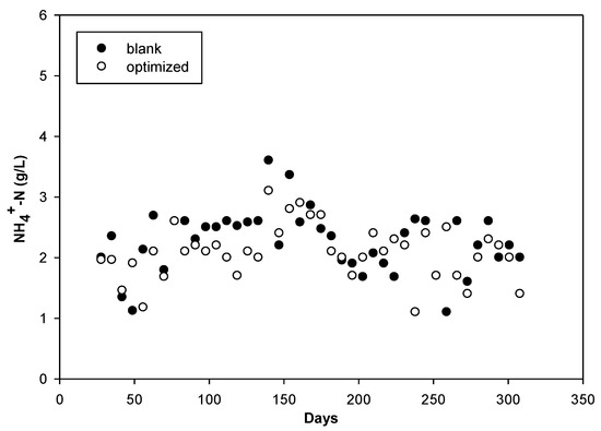 There are no significant differences in the average NH4+ -N concentrations in the influent and effluent from both digesters; however, concentrations fluctuated over time (shown in Figure 5). In the blank, the average concentration of NH4 +-N concentration fluctuated between 1.1 and 2.6 g/L, with an average of 2.3 ± 0.5 g/L at 40 days HRT. The concentration varied between 1.2 and 2.6 g/L and averaged 2 ± 0.3 g/L in the optimised digester. After the change of HRT to 30 days and an increase of OLR, NH4+-N concentration peaked at 3.6 g/L in the blank and 3.1 g/L on day 140, but later dropped and averaged 2.2 ± 0.5 and 2.1 ± 0.5g/L until the end of the experiments in the blank and optimised digester, respectively. Generally, these moderate NH4 +N concentrations did not cause adverse inhibition in the digesters because of the acclimatisation of feed and digesters operating temperature (mesophilic). The VFA accumulation (2.5 g/L, day 140) in the blank digester during the experiment might have been induced by moderate inhibition of NH4+-N concentrations at 3.4 g/L–3.6 g/L. However, overall there is no clear pattern between NH4+-N and VFA in either digester.