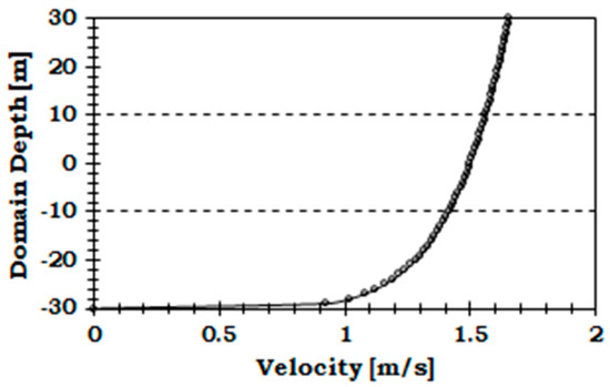 Two sets of operational conditions are utilized in this study. These operating conditions are (1) uniform velocity and (2) a velocity profile following the 1/7th power law, which are used as the inlet velocity conditions to model the fluid and structural dynamics of the tidal turbine. Tidal turbine rotor blades are typically nearly neutrally buoyant. In this case, the buoyant forces and gravitational forces approximately balance and therefore the gravitational/buoyant effects are ignored in the simulation. The turbine is considered to be fixed pitched with neutrally buoyant blades. The density of water is assumed to be constant (1000 Kg/m3), and that the flow was free of cavitation. Therefore, the effects of cavitation are also not considered in the simulations. The turbine is simulated at the peak power condition of Tip Speed Ratio (TSR) 4.87 corresponding to the turbine rotational rate of 0.7 rad/s. This operational condition is selected because the largest bending moments occur when the turbine operates near peak power [32]. For the uniform velocity case, mean free stream velocity is set at 1.5 m/s, with a turbulence intensity of 5% and viscosity ratio of 10. For the velocity profile case, it is assumed that the velocity profile follows the 1/7th power law. While velocity profiles vary considerably from site to site depending on the local bathymetric conditions, these velocity profiles can typically be approximated using power laws. The 1/7th and 1/10th power laws have been used to estimate the velocity profiles for EPRI North American tidal in stream power feasibility demonstration project [40] and other previous research works [14,38]. The flow is assumed to only vary along the depth, and stays uniform across the width of the domain. The velocity profile is estimated using a simple 1/7th power law equation (). Here, is the velocity at the surface of fluid domain, is the depth at position and is the total domain depth. To enable direct comparison with the uniform velocity case, the velocity is distributed such that velocity at the hub height is 1.5 m/s. The mean velocity above the hub height is therefore greater than this value, while the velocity below the hub is smaller. The average velocity across the turbine swept area is 1.496 m/s, and the turbine rotational velocity is calculated using this velocity for an estimate of the optimum TSR. A plot of the mean velocity profile used at the inlet condition in this paper is provided in Figure 1. This velocity profile changes once the flow passes the turbine. The velocity profile at different downstream locations can be clearly visualized in the results and discussion section of this paper.