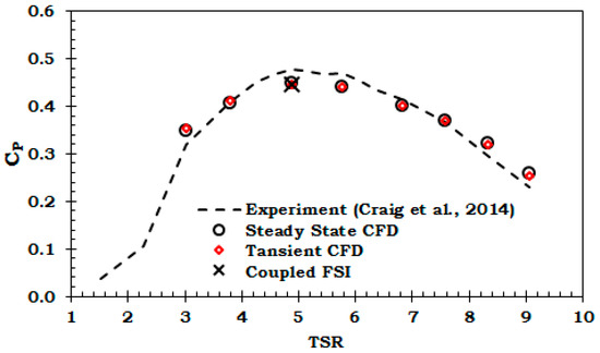 To further validate the utilized numerical methods, power coefficients predicted by the steady state, transient analysis and coupled FSI analysis of the full-scale model are compared with model scale experimental data [39] in Figure 5 and Table 3.