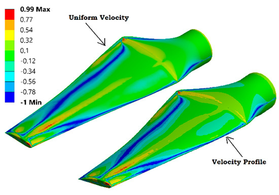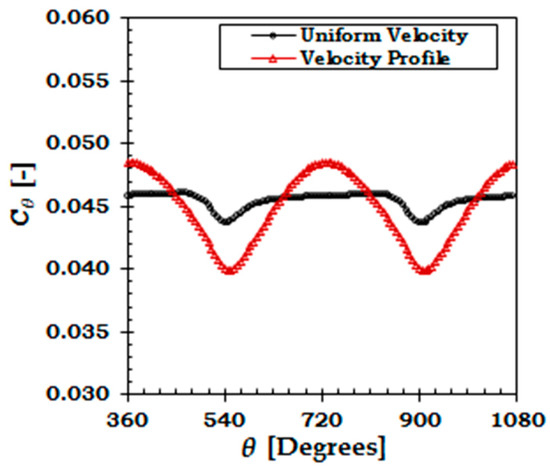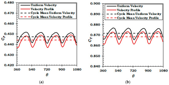 Performance coefficients of the whole rotor, obtained from the FSI simulations, for a uniform inlet velocity and velocity profile are presented in Figure 6.