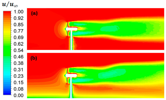 Axial velocity (normalized by the free stream velocity) contour for (a) uniform inlet velocity; (b) velocity profile.