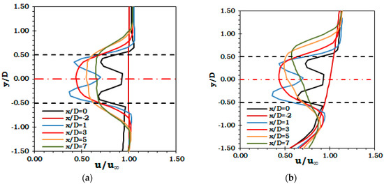 Apart from load variations, the constituent fluid dynamic component of the coupled FSI analysis is capable to provide a very good visualization of the turbine flow field. Figure 10 shows that for uniform velocity case the wake is axisymmetric. The addition of velocity profile has shifted the wake upwards and velocity in the lower part of the wake has decreased. To further quantify this effect, velocity variation along the depth of the channel at different downstream locations is provided in Figure 11. The inflow velocity is unaffected up to a distance of 2D upstream (x/D = −2) in both cases. At the turbine location (x/D = 0) and 1D downstream (x/D = 1), the velocity variation is almost similar between the two cases. However, further downstream at (x/D = 3) and beyond that the wake has clearly shifted upwards. For the velocity profile case, the velocity in the upper bypass region of the wake has increased.